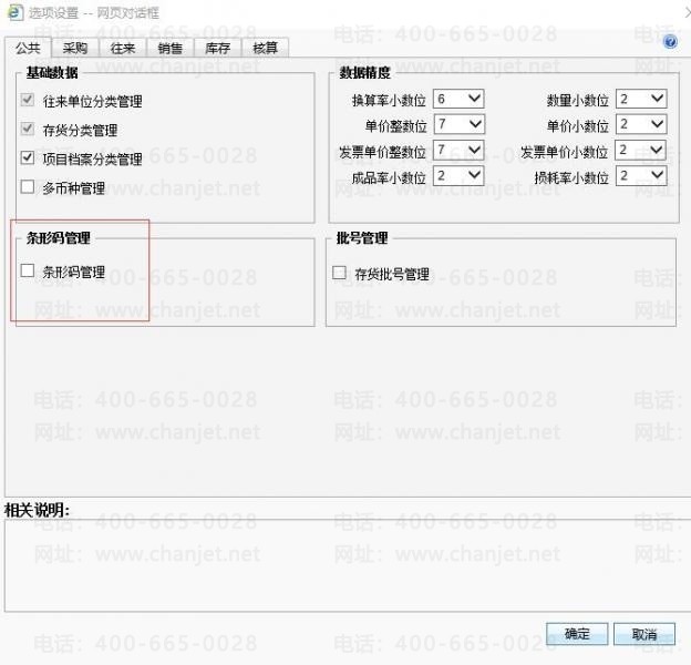 操作:系统→账套设置→选项设置→公共→条形码管理