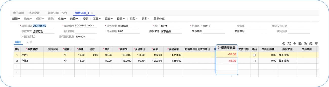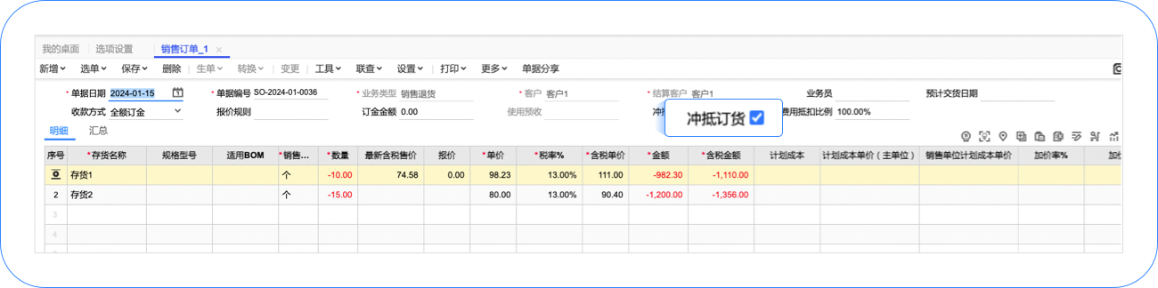2)【冲抵订货】的订单保存后,会回写原销售订单的【冲抵退货数量】。