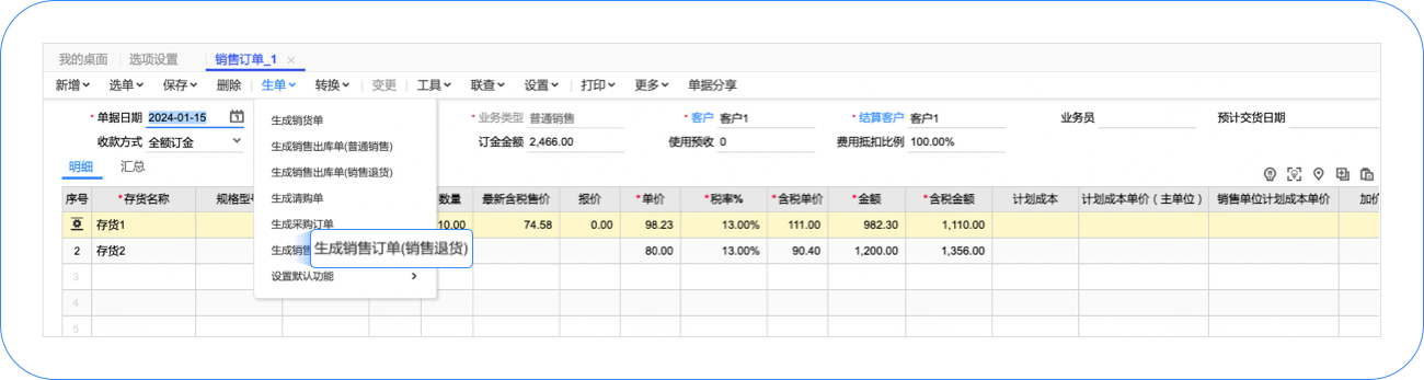 1)销售订单,生成销售订单(销售退货)。系统会自动带入未执行部分数据,并自动勾选【冲抵订货】。