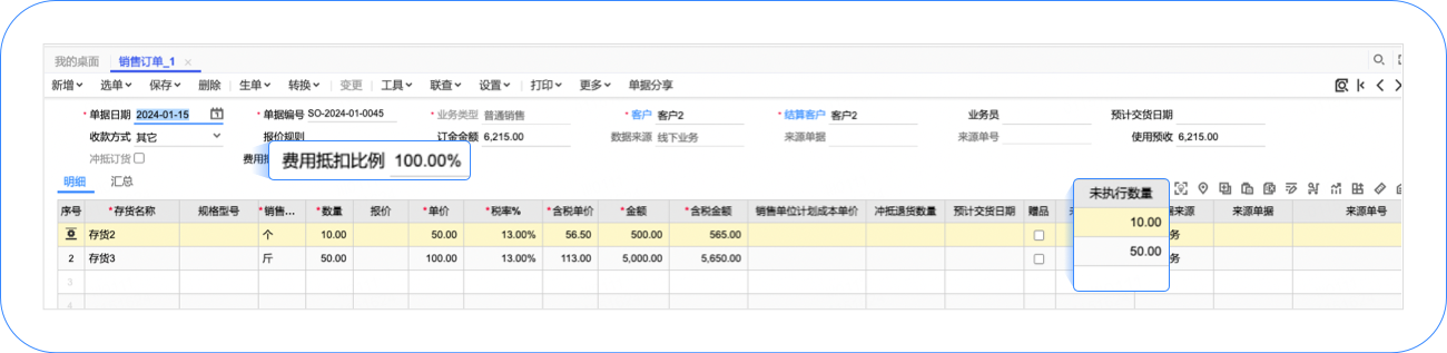 三、销售单据增加未执行数量,费用抵扣比例支持设置