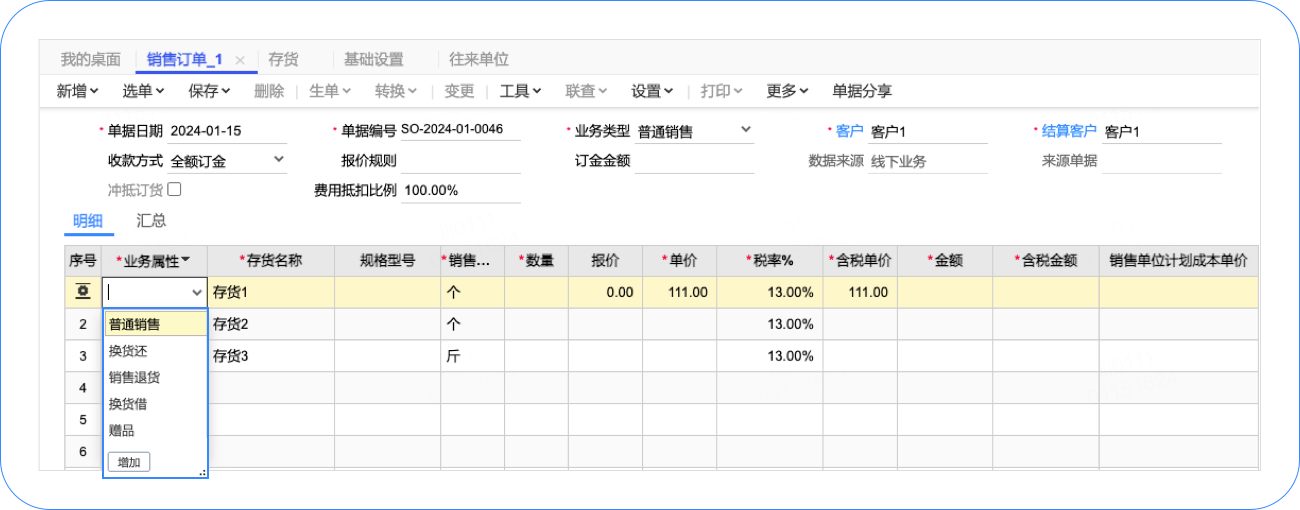 二、销售订单、销货单的业务属性枚举值支持自定义。