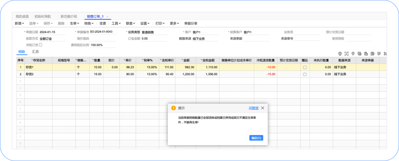 3)当在销售选项中勾选了【严格按照订单销售】、【严格按照订单生产】、【严格按照订单采购】后,订单执行时生成下游的销货单/销售出库单、采购订单、生产加工单时,冲抵部分数据均不允许执行。