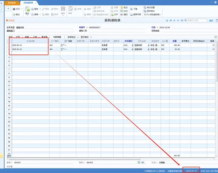 请购单手工关闭时,关闭日期取值是关闭操作时的登录系统日期。