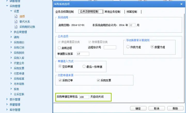 2、选项-公共及参照控制中,设置采购单据在审核后XX天自动关闭,该天数默认100天。(若看不到这个选项,请备份账套更新最新采购PUOM结尾的补丁即可,此条件与入库完成、开票完成、付款核销完成为且的关系)