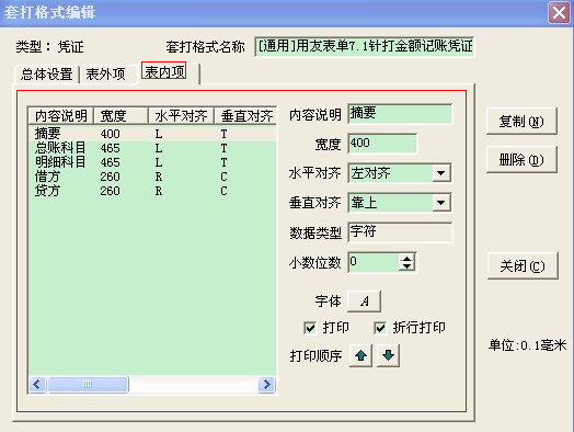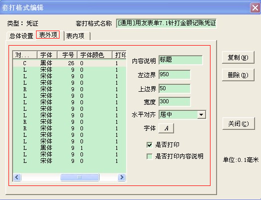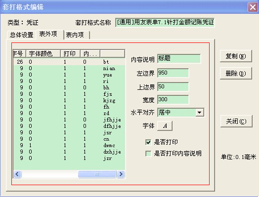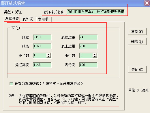点击“复制”从系统模板中复制一份过来,输入套打格式名称,在总体设置中设置页的属性,如上图。