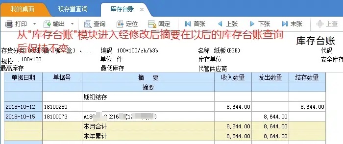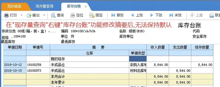 而从“现存量”点右键进入库存台账界面后,摘要栏不是我想要的,我修改后,下次从“现存量”点右键进入库存台账界面后,摘要栏又恢复为默认值需要重新修改。