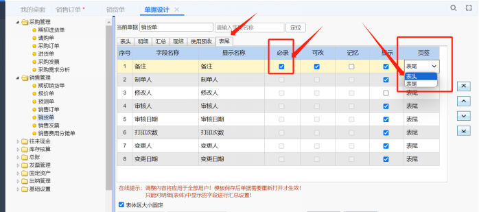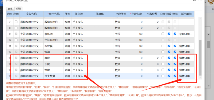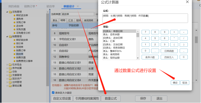 2、通过系统管理的单据设计,增加公用自定义项(长度、宽度、件数),并设置数量公式进行自动计算即可完美解决,针对备注问题,也可以把表尾的备注放在表头,并设置必填!自定义项一定要选择公用的,这样就可以在适用单据,选择“销售订单、销货单、销售出库单等等”方便后续其他人员查看。