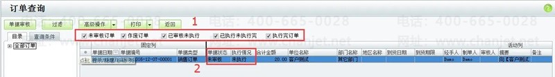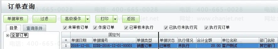 1.订单状态是未审核,选择单据,点击高级操作,单据审核。Ps:查询订单的时候将 未审核订单,作废订单,已审核未执行,已执行为执行完和执行完订单都勾选上