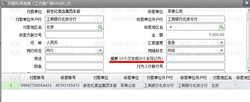 目前银企直连,往银行发送指令是有字数限制的,刚上线的一些企业经常因为不了解字数限制导致摘要过长被银行退回。修改提示问题文字提醒摘要补录时不要超出限制。工商银行对摘要的限制是“10个汉字或20个字符以内”