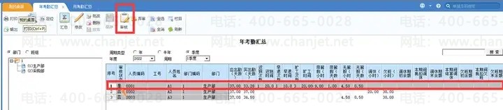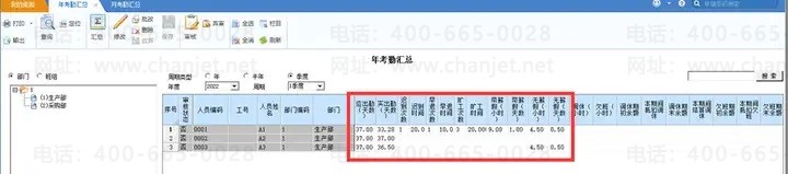 2、年考勤汇总支持按季度、半年、年三种周期类型进行汇总