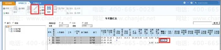 【数据处理】-【年考勤汇总】,点“修改”,如修改A2的调休(小时)为20,点“保存”