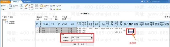 应用价值:年考勤汇总可以按年、半年、季度来汇总显示考勤数据,并且支持手工修改便于灵活调整考勤数据