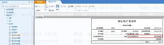 B.应用操作:【固定资产】-【变动单】-【使用状况调整】进入变动单填写界面,选择卡片编号,自动带出卡片上的其它信息,需要录入“变动后使用状况”和“变动原因”即可保存。