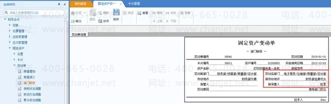 B.应用操作:【固定资产】-【变动单】-【部门转移】进入变动单填写界面,选择卡片编号,自动带出卡片上的其它信息,需要录入“调整后部门”和“变动原因”;“存放地点”“保管人”若同步发生变化也可以在此变动单上输入新信息,没有的话可以不输入。