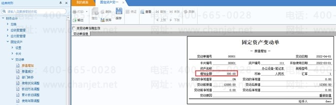 B.应用操作:【固定资产】-【变动单】-【原值增加】进入变动单填写界面,输入卡片编号或资产编号,资产的名称、开始使用日期、规格型号、变动的净残值率、变动前净残值、变动前原值自动列出。输入“增加金额”,参照选择币种,汇率自动显示,并且自动计算出变动的净残值、变动后原值、变动后净残值,输入变动原因点击“保存”即完成该变动单操作。