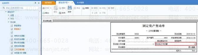 B.应用操作:【固定资产】-【变动单】-【工作总量调整】进入变动单填写界面,选择卡片编号,自动带出卡片上的其它信息,需要录入“变动后工作总量”和“变动原因”即可保存。