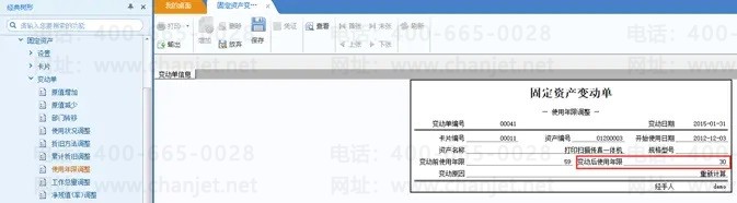 B.应用操作:【固定资产】-【变动单】-【使用年限调整】进入变动单填写界面,选择卡片编号,自动带出卡片上的其它信息,需要录入“变动后使用年限”和“变动原因”即可保存。