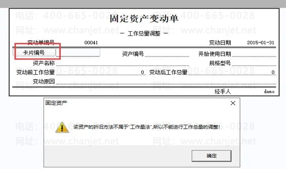 C.工作总量调整变动单只适用于折旧方法为“工作总量法”的卡片,否则会有下图的提示: