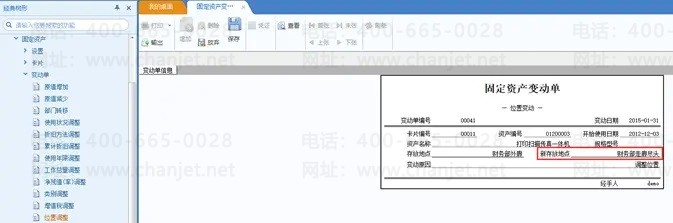 B.应用操作:【固定资产】-【变动单】-【位置调整】进入变动单填写界面,选择卡片编号,自动带出卡片上的其它信息,需要录入“新存放地点”和“变动原因”即可保存。