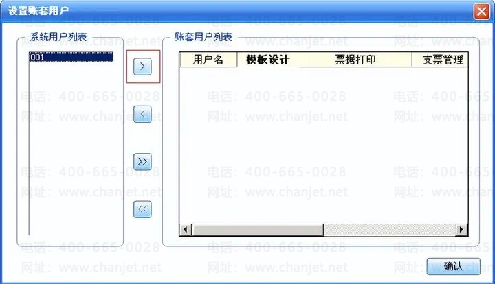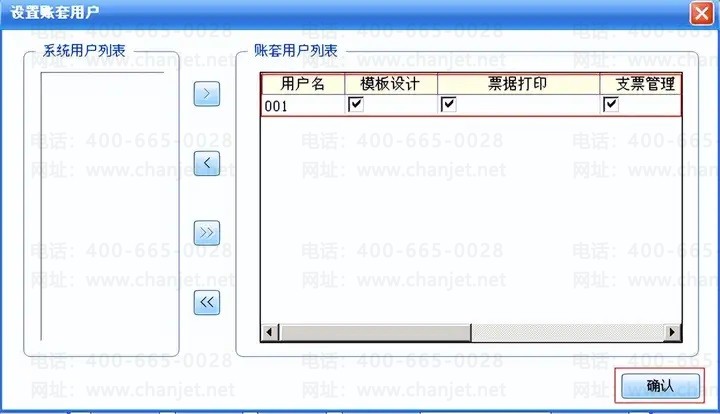 5.在账套用户列表中,给予操作员相应的操作权限后点击确认。