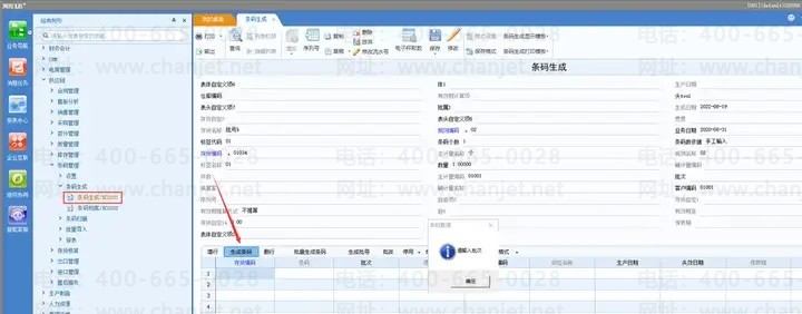 3.在条码生成中,录入好存货,数量等信息后,点击【生成条码】按钮,在生成条码的同时,系统会根据批号规则生成批次。