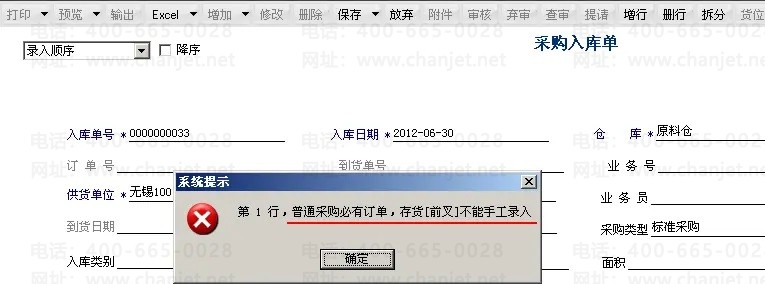 采购必有订单模式必须要参照采购订单生成红字采购入库单不能直接填写。