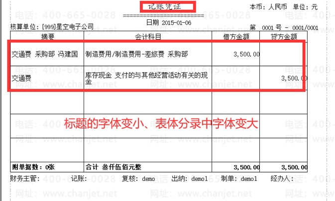 例:将标题“记账凭证”字体调小、分录的字体调大