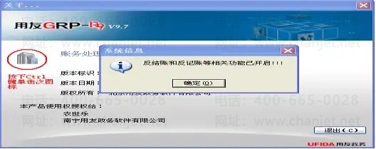 重新登录账务处理系统后,点击【帮助】--【关于】,调出‘关于’对话框,按下〖Ctrl〗键不放,用鼠标单击账务处理系统图标,即可将反记账、反结账功能开启。