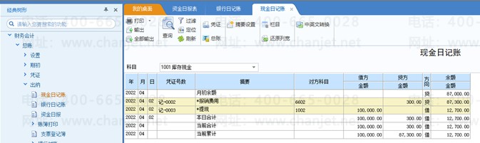 本功能用于查询输出现金、银行存款科目某日的发生额及余额情况。