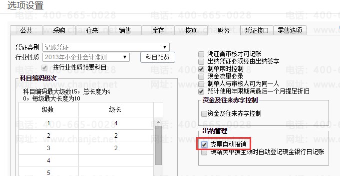 1.【系统管理】- 【选项设置】-【财务】,勾选【支票自动报销】。