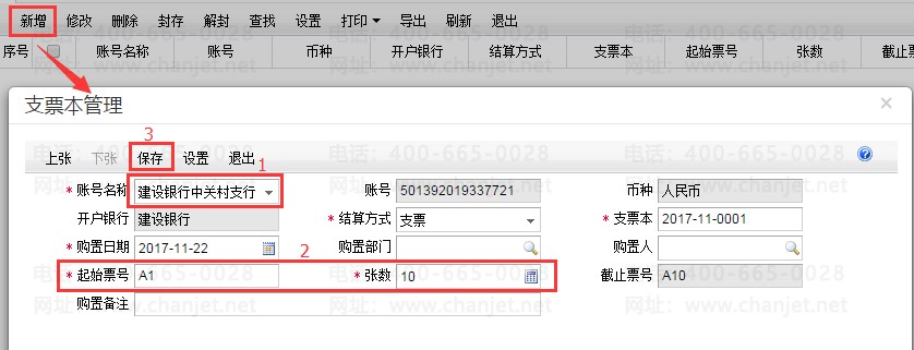 3.【出纳管理】-【支票本管理】,输入帐号名称、起始票号、张数等。