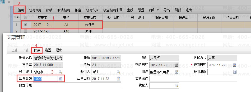 4.【出纳管理】-【支票管理】,选中需要领用的支票,输入金额,保存。