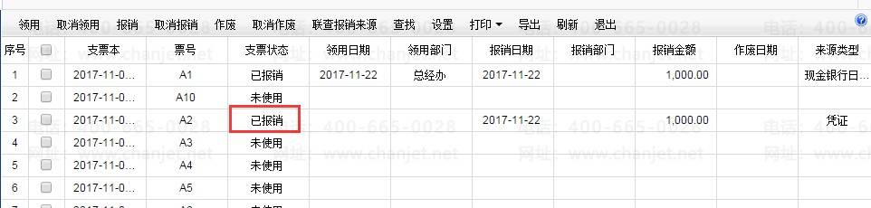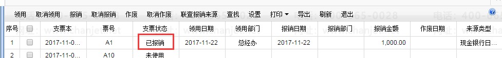 6.再次在【支票管理】中,查看支票状态为【已报销】。
