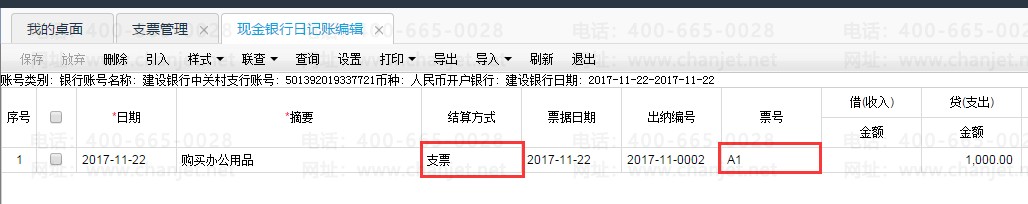 5.【出纳管理】-【现金银行日记账】填制现金银行日记账,注意结算方式与票号一定要与之前领用的一致,否则会与支票本管理的票据对应不上。