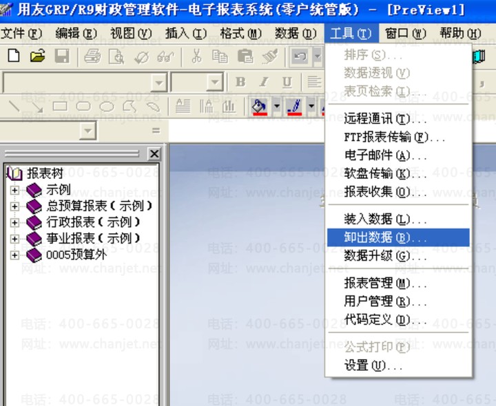 一、在电子报表系统中,点击“工具”——“卸出数据”