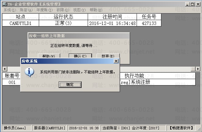 结转应收应付的时候提示“系统所用部门被非法删除,丌能结转上年数据”,如图示: