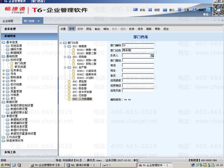 2、在 2017 年度库中增加“商务部”这个部门档案。