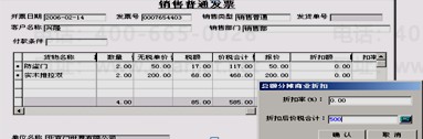 这样的话,就会按照500/585的比率对金额进行平均分配,折扣率和折扣后价税合计填写一个,会自动计算另一个。按照比例对发票中的商品进行分摊。在相关账表,如销售统计表中查询折扣额栏目。