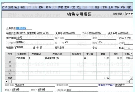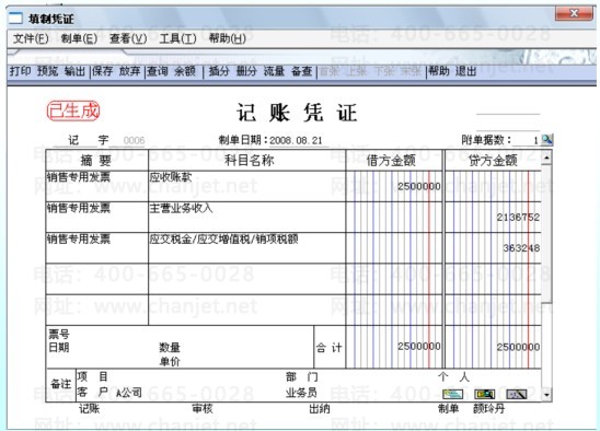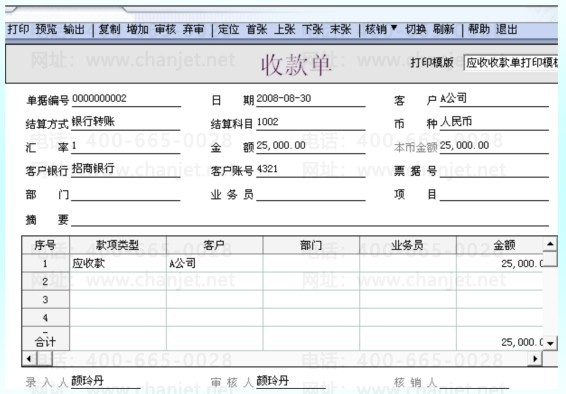 8、2008.8.30收到A公司的款项25000元,需要填制一张收款单,一张销售专用发票。