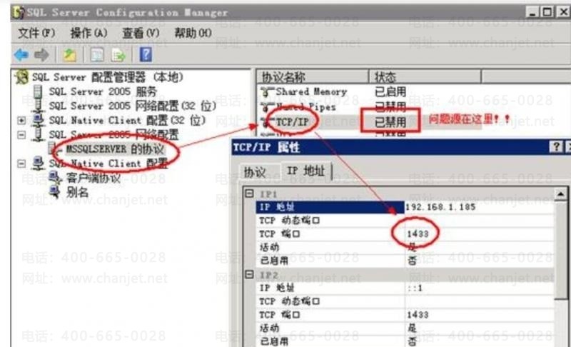 知之为知之,不知问百度,搜索结果挺多,给出的解决方法也不外乎上面几项,其中有一个是修改数据库端口后解决的,不过人家的数据库用的是SQLsever2000SP4,莫非我的问题也在这里么?在开始菜单中找到[SQLserverconfigurationmanager],在左侧窗口中的展开目录菜单,找到SQLServer2005网络配置----MSSQLSERVER的协议,打开右侧窗口总的TCP/IP协议属性,发现端口仍然是1433,但是却发现状态是禁用的,果断将其启用。