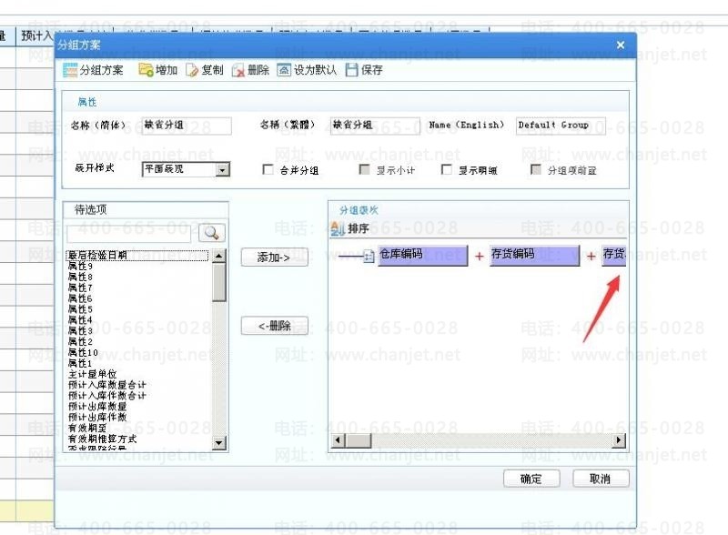 点上面的‘分组’ ,新建个分组 双击存货名称或者拖到上面的格子里,保存之后查询的时候分组选你新建个这组就有存货名称了。