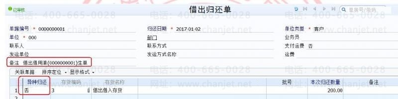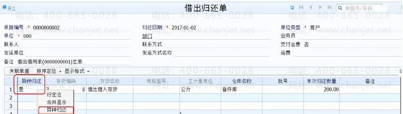 3.1非异种归还时,参照借出借用单做借出归还单,表体异种归还可选择是或否,选择否则是归还原借出存货。