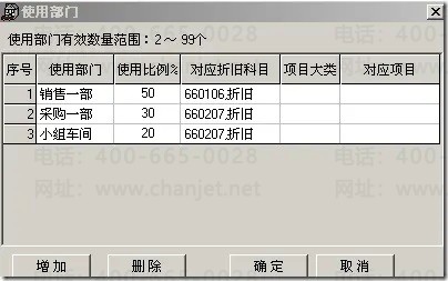 点击增加,录入使用部门和使用比例,以及对应的折旧科目