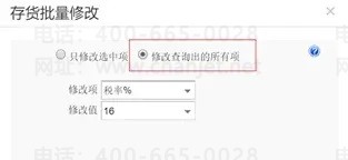 在【存货批量修改】的界面:建议选择【修改查询出来的所有项】,【修改项】选择【税率%】,【修改值】输入正确的税率值。