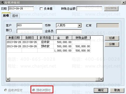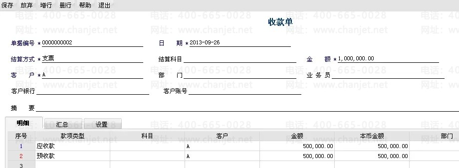 7.打开收款单后,修改,将表体部分拆分两条记录,一条为应收款500000,一条为预收款500000,如下图所示: