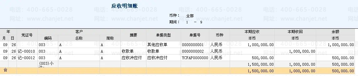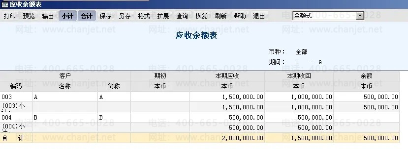 12.查询应收余额表,A客户余额500000,B客户已结清