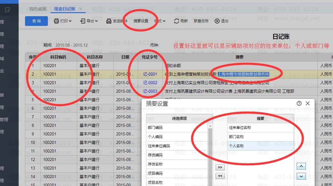 问题分析:在这里我们可以通过T+银行(现金)日记账显示报表上访的摘要设置。来显示对方科目所对应的往来单位,部门或个人等辅助项目。