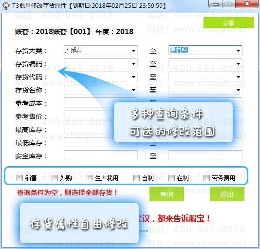 如今有了T3存货属性批量修改工具,成百上千种的存货,都可以一键批量修改!存货编码、存货名称、参考成本、参考售价,是否销售、是否采购、是否生产耗用、是否自制、是否在制、是否劳务费用、最高库存、最低库存、安全库存等,这些商品属性都能批量修改。曾经需要耗费两天的时间,如今十分钟就可以轻松解决!每个季度末再也不用为了这事加班了!