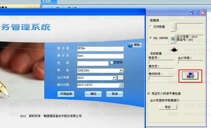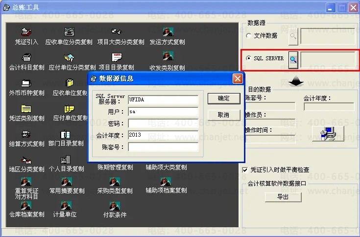 2.选择数据源SQL SERVER,点击放大镜,在数据源信息中录入数据库密码及被复制账套号