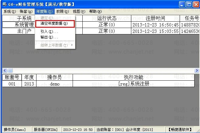 补充:如果是放弃当前账套所有数据而保留基础档案,重新录入数据的话,可以用账套主管登陆“系统管理”,在账套下进行“清空年度数据”的操作